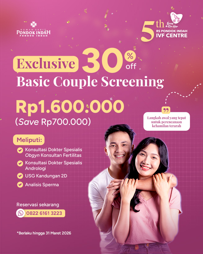 Dalam rangka 5 Tahun RS Pondok Indah IVF Centre, kami menghadirkan Exclusive Basic Couple Screening dengan penawaran khusus 30% sebagai langkah awal evaluasi kesuburan bagi Anda dan pasangan yang sedang merencanakan kehamilan.